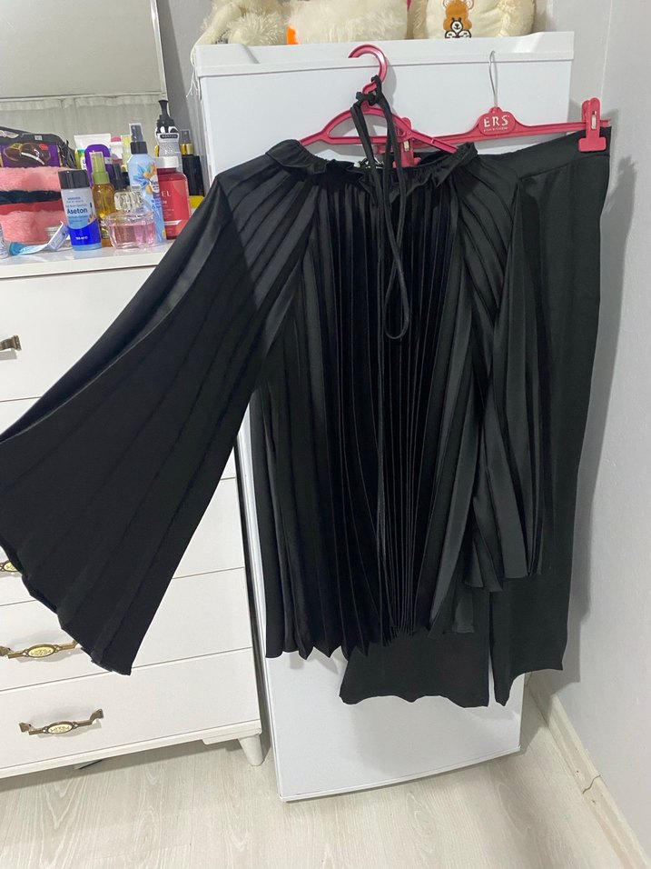Siyah saten kumaştan üretilmiştir kalitesi çok güzel ve ağır ince ip kemeri var Pantolonun beli lastikli sadece bir defa nişanda kullanıldı özel günlerde davetlerde çok rahat kullanabilirsiniz kalitesi güzel sorunsuz temiz S beden ama M beden içinde uygundur