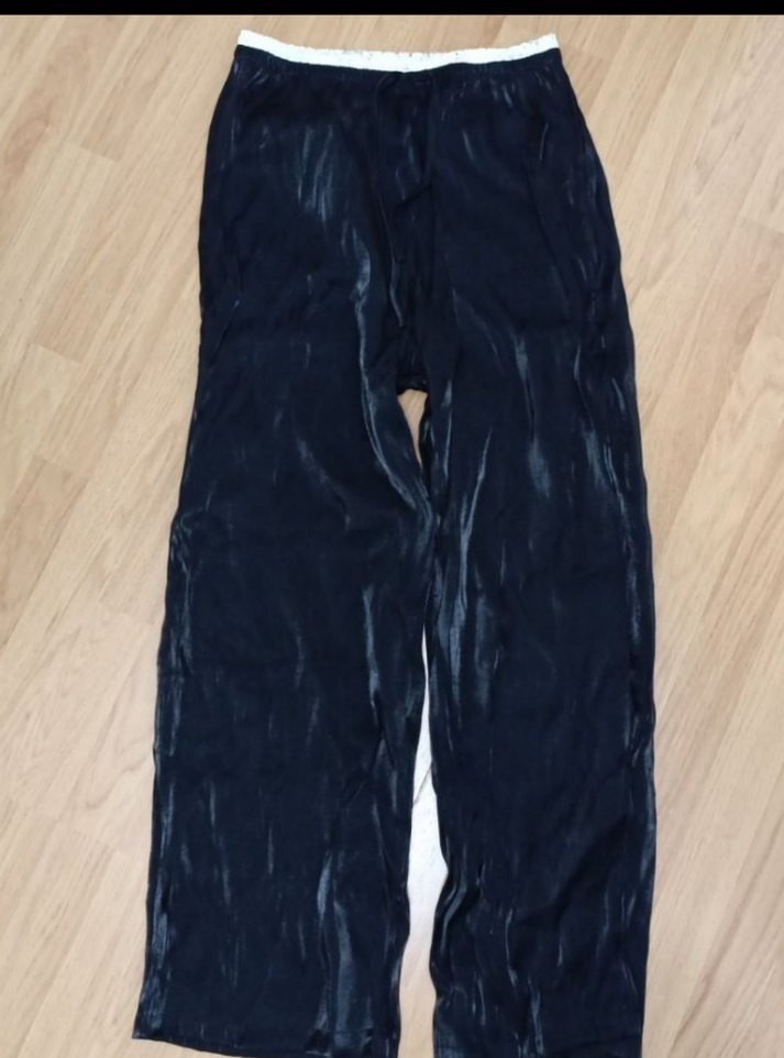 siyah saten kumaştan, bol kesim ve piliseli tasarıma sahip midi boy kadın pantolon. Lastikli bel ve günlük kullanıma uygun.