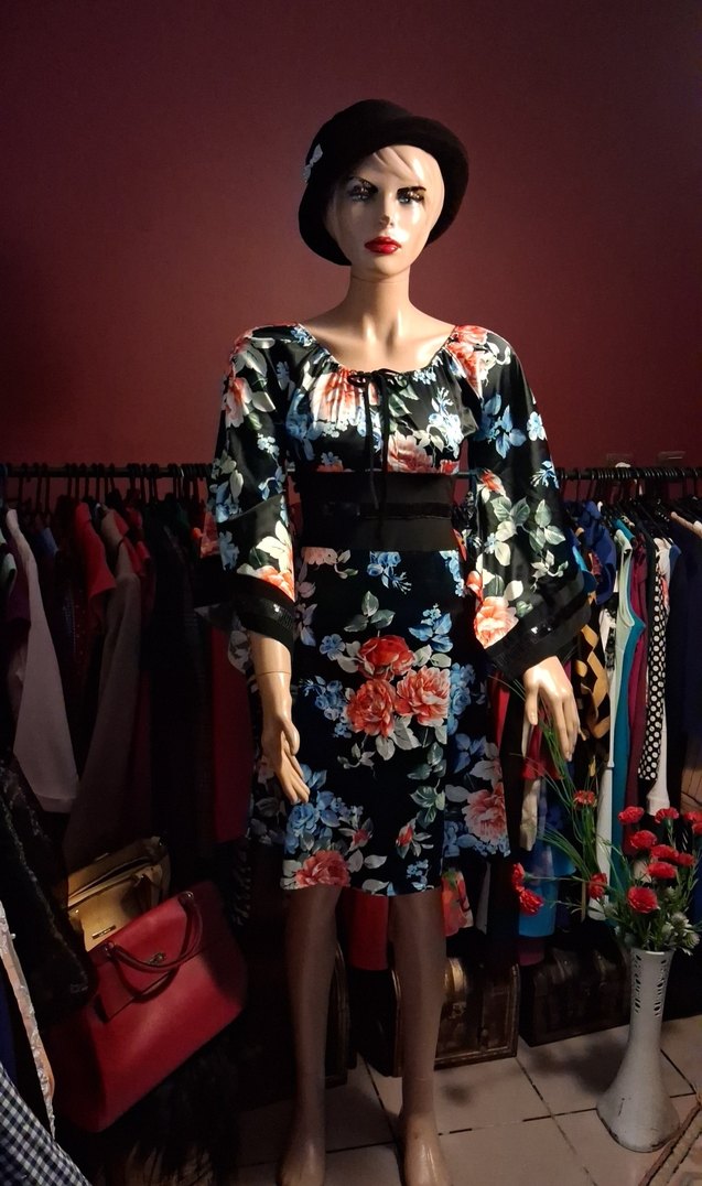 Siyah saten üzerine çiçekli abiye elbise