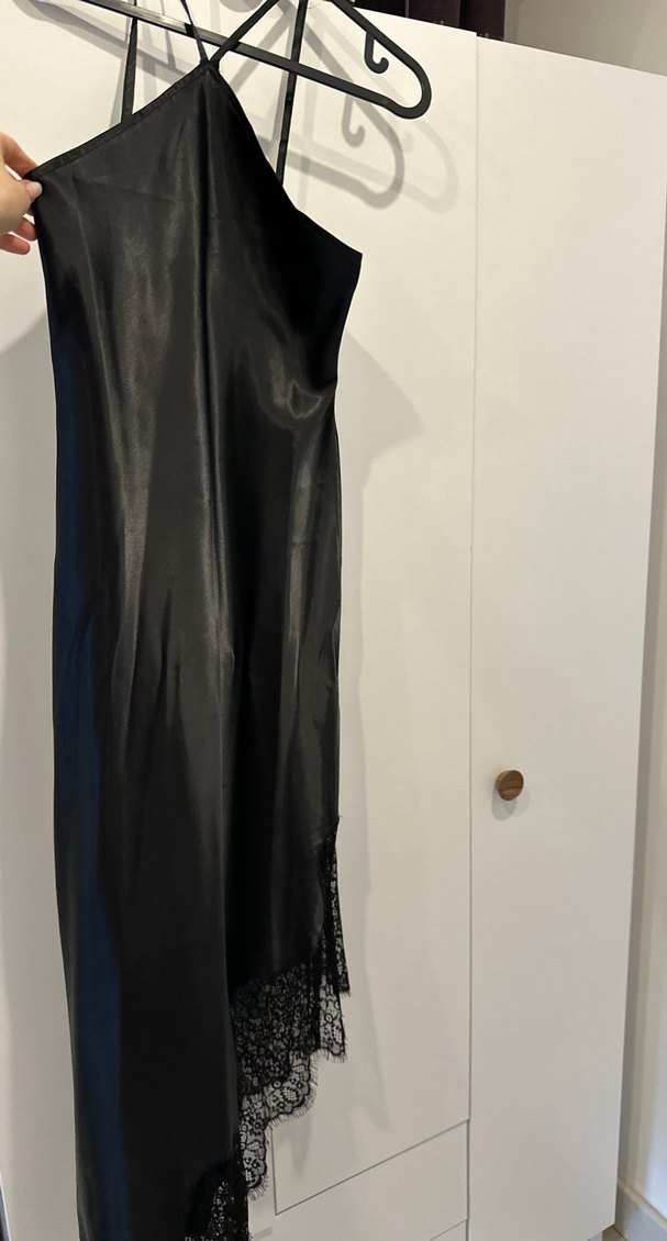 Siyah uzun elbise, saten kumaştan, halter yaka ve kolsuz tasarıma sahip. Drapeli detaylar ve dantel etek ucu romantik gece için uygun.