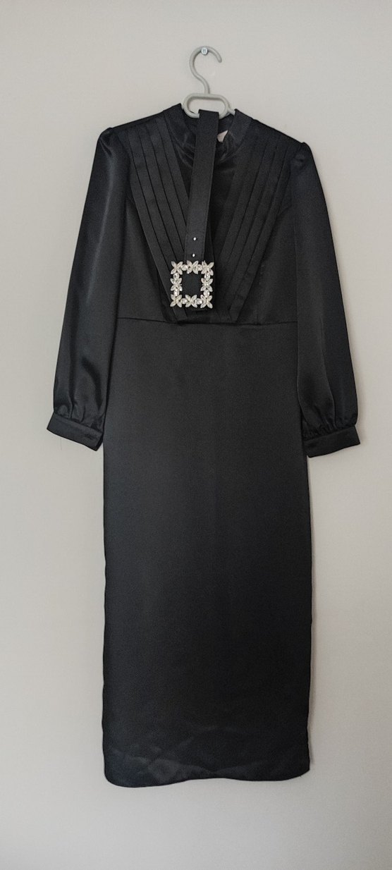 marka siyah uzun elbise, yakasında kesik detay, askılı kollu ve nakışlı desene sahip. Kemerli bel ve klasik şıklık sunar, ofis için uygundur. özel günler için uygundur