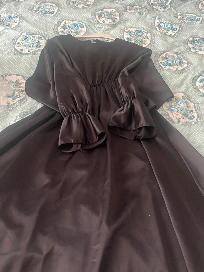 Siyah uzun elbise, uzun kollu ve yuvarlak yakalıdır. Saten dokusuyla dökümlü, bol kesim ve gotik tarz sunar. Günlük kullanıma uygundur.