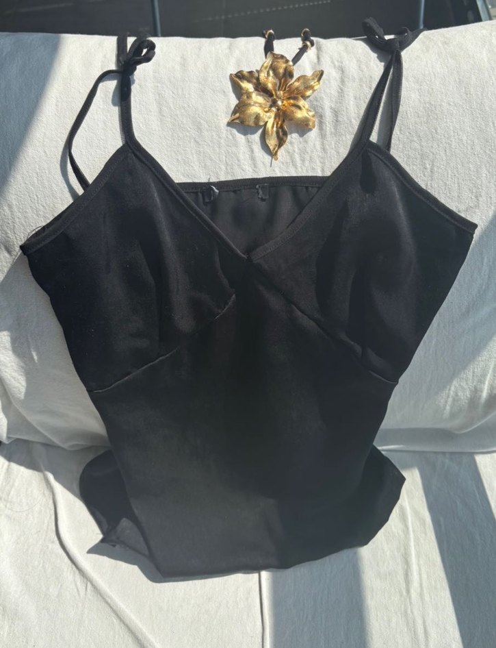 V yakalı, ayarlanabilir askılı, siyah süet mini kadın atlet. Minimalist goth tarzıyla kısa ve vücuda oturan kesim. S bedeni uyumlu kolları da askıları ayarlanabilir. Bağlamalı çünkü