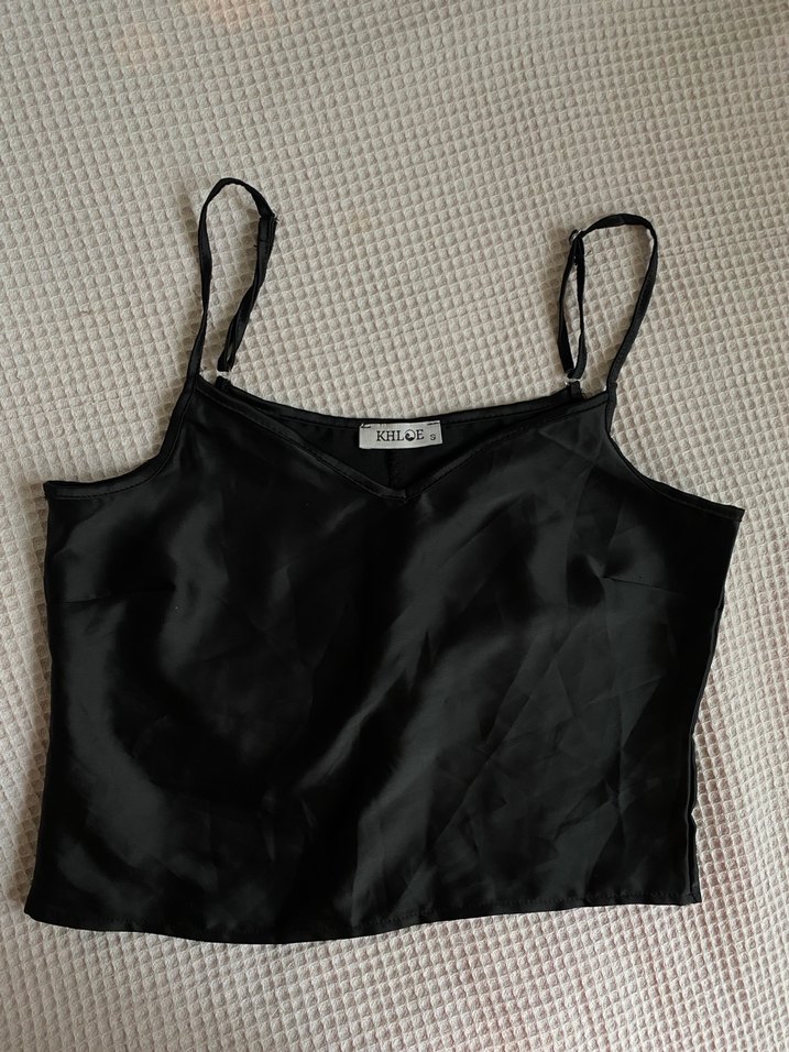 Ince askılı, V yakalı ve saten dokulu bu siyah kadın atlet, parlak ve şık goth tarzı sunar, günlük kullanıma uygundur.
