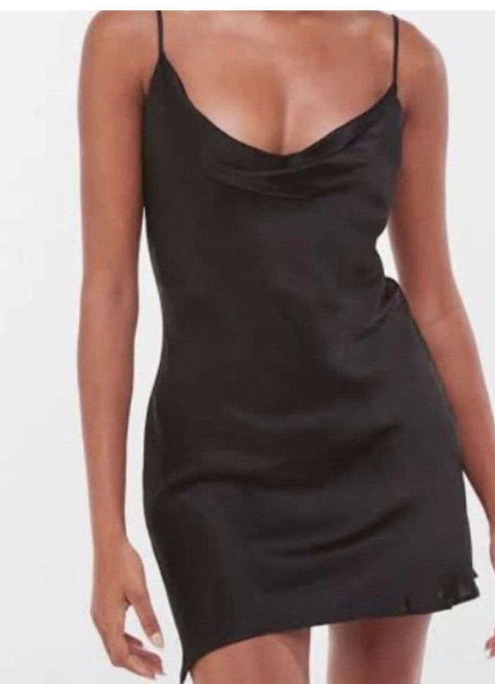 Saten kumaştan, drapeli V yakalı ve ince askılı, vücuda oturan siyah mini elbise, cesur ve minimalist gotik tarz için uygundur. ✨aldım ama bır kere gıyındım S beden yanları yırtmaçlı mını sıyah