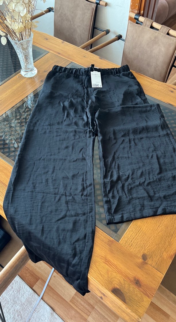 Siyah, saten kumaştan, salaş kesim ve pileli tasarımlı midi uzunlukta kadın pantolon. Rahat ve şık, romantik buluşmalar için ideal.