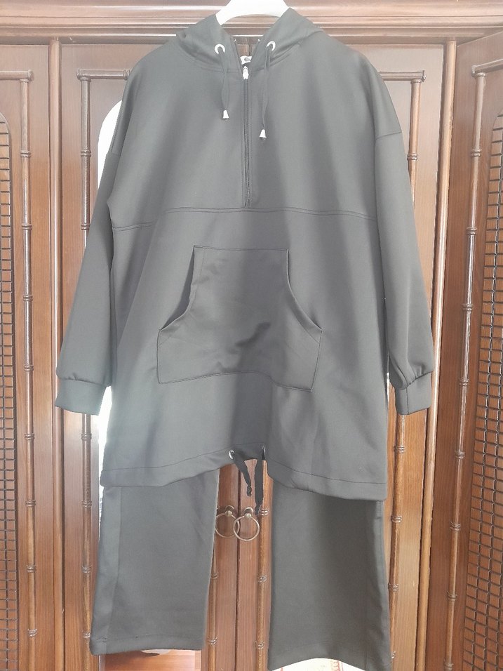 siyah renkli, kapüşonlu ve fermuarlı uzun üstü ile rahat kesim kadın eşofman takımı. Yumuşak ve sıcak kumaştan, günlük kullanıma uygundur. ♀️
