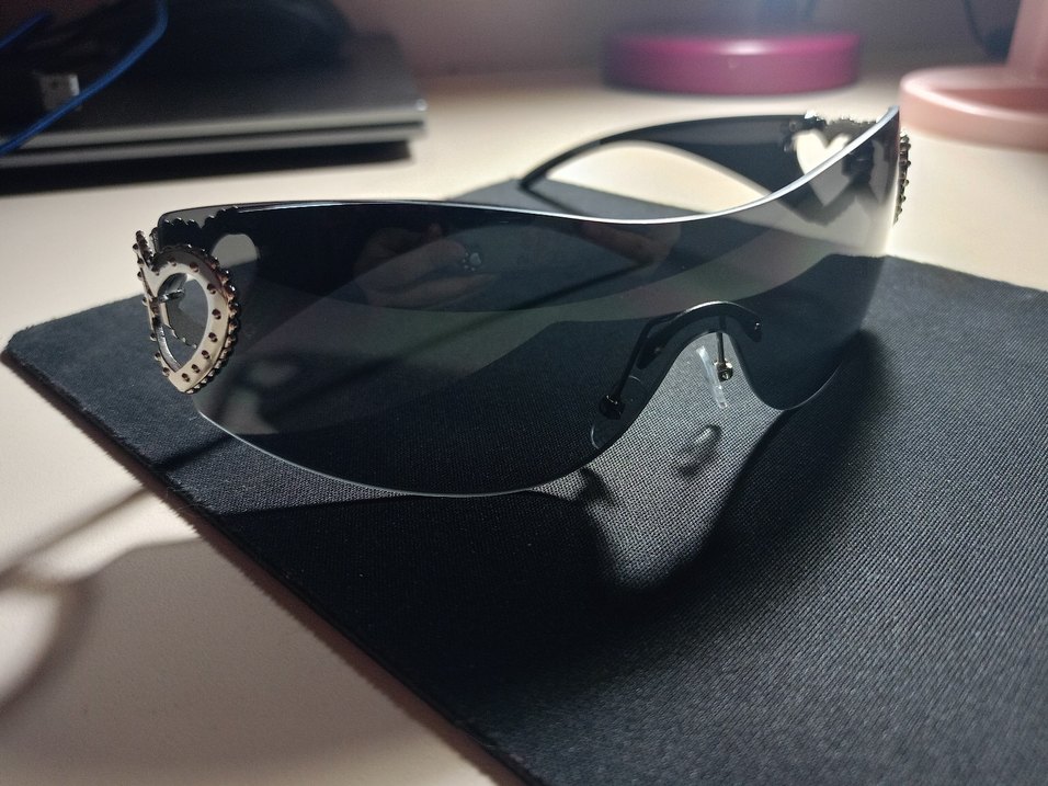 Şeffaf koyu renkli camları ve minimalist tasarımıyla siyah biker tarzı kadın güneş gözlüğü, avant-garde ve trend belirleyici bir modeldir. ️
