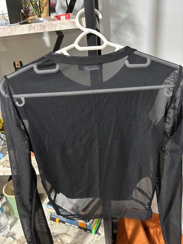 Siyah şeffaf sentetik kumaştan, boğazlı ve uzun kollu, fitted kesim midi boy bluz. Gotik ve athleisure tarzıyla dış mekan kullanımı için uygun.