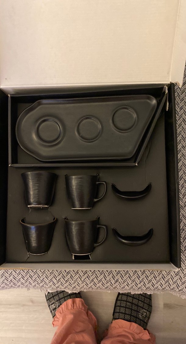 Kutuda dört adet kulplu siyah seramik fincan, tabaklar ve iki kaşık koyma yeri bulunur. Mat yüzeyli, modern tasarımda bir set. ☕