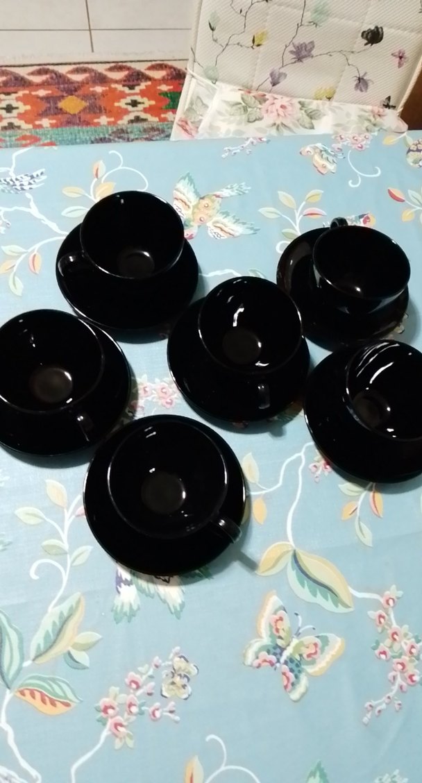Altı adet siyah seramik kahve fincanı ve tabakları, sade ve şık tasarım sunar. Kahve veya çay servisi için uygundur. ☕