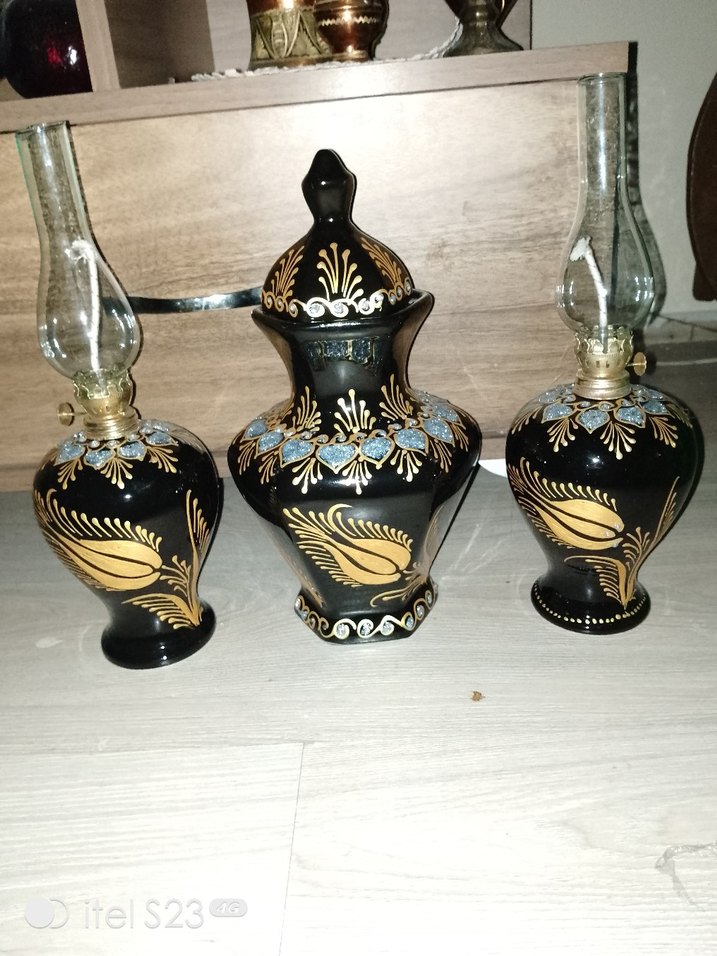 Camlı, siyah vintage lambalar seti, altın ve mavi çiçek desenleriyle süslenmiş. Ortadaki parça kapaklıdır. ️