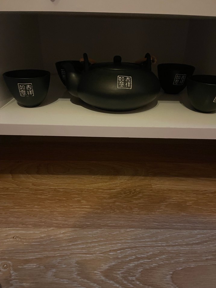 Mat siyah çinçe desenleri olan 4 fincan bir demlikten oluşan seramik set . Dekor olarak durduğu için hiç kullanılmadı