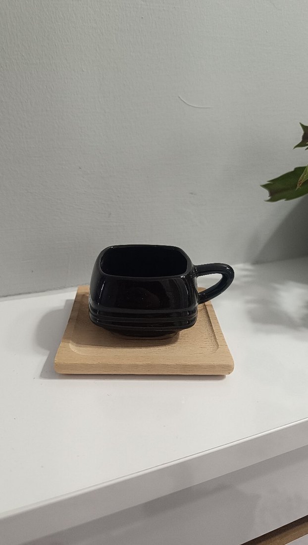 Kulplu siyah seramik kare fincan, ahşap altlık üzerinde, sıcak içecekler için uygundur. ☕ 6 Adet altlık 6 adet fincan set halinde