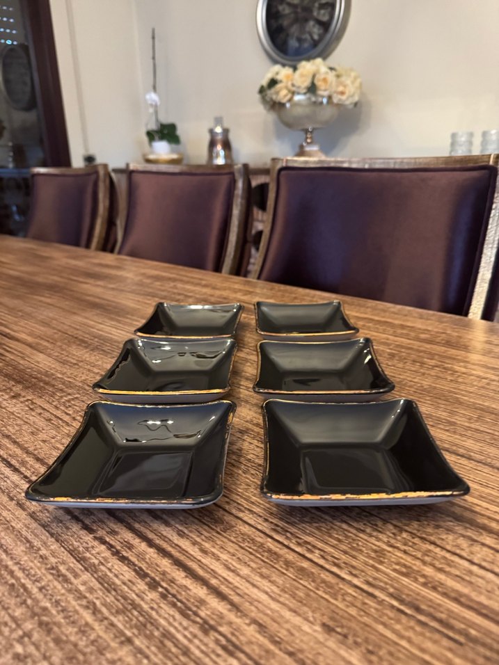 Parlak yüzeyli, altın detaylı siyah seramik küçük kare tabaklardan oluşan 6'lı set, aperatif veya sos sunumları için uygun. ️