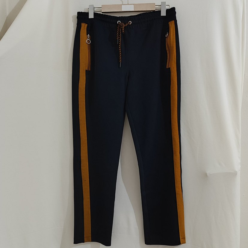 Sentetik kumaştan, kahverengi yan şeritli ve kemerli bel detaylı siyah erkek eşofman altı. Günlük kullanıma uygun, normal kesim ve midi boy.