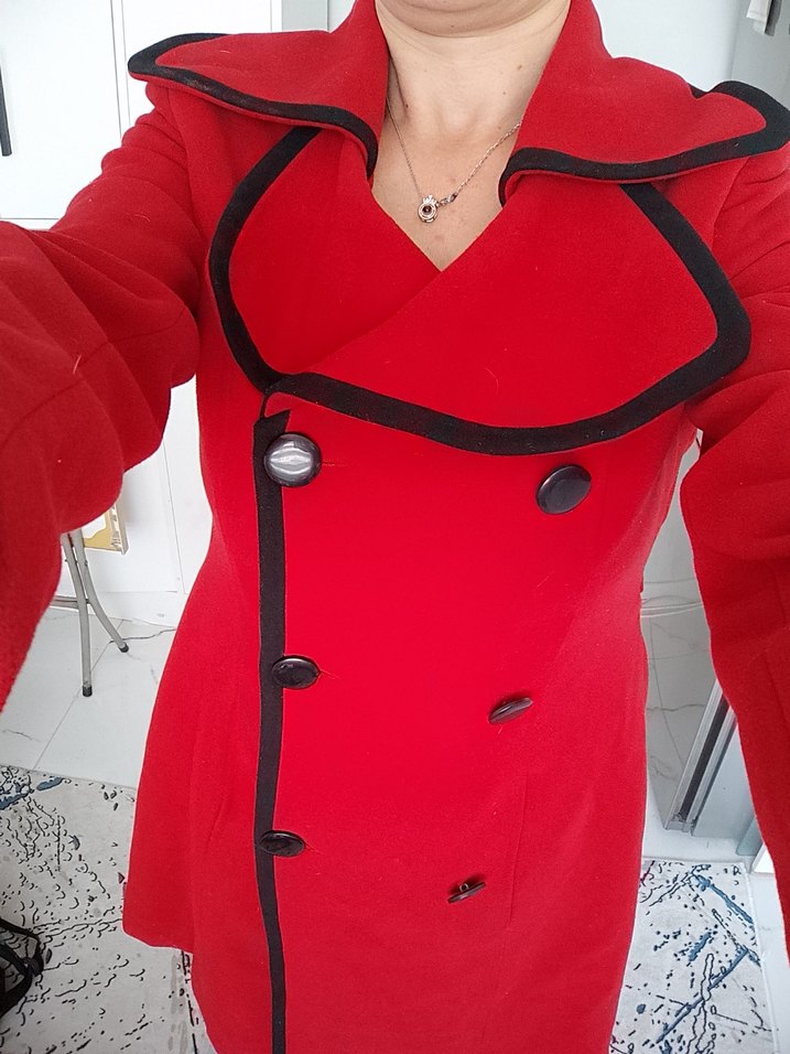 42 beden Siyah şerit detaylı, çift düğmeli kırmızı kadın kaban, şık ve sıcak tutar.
