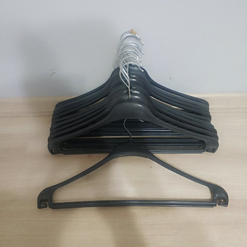 Metal askılı siyah plastik askılık seti, kıyafetleri düzenlemek için uygundur, pantalon asılır, ürün sıfırdır, sert ve kaliteli, uzun süre kullanılır. Elimde 50 adede kadar var, isteyene daha fazla satış yapılır.