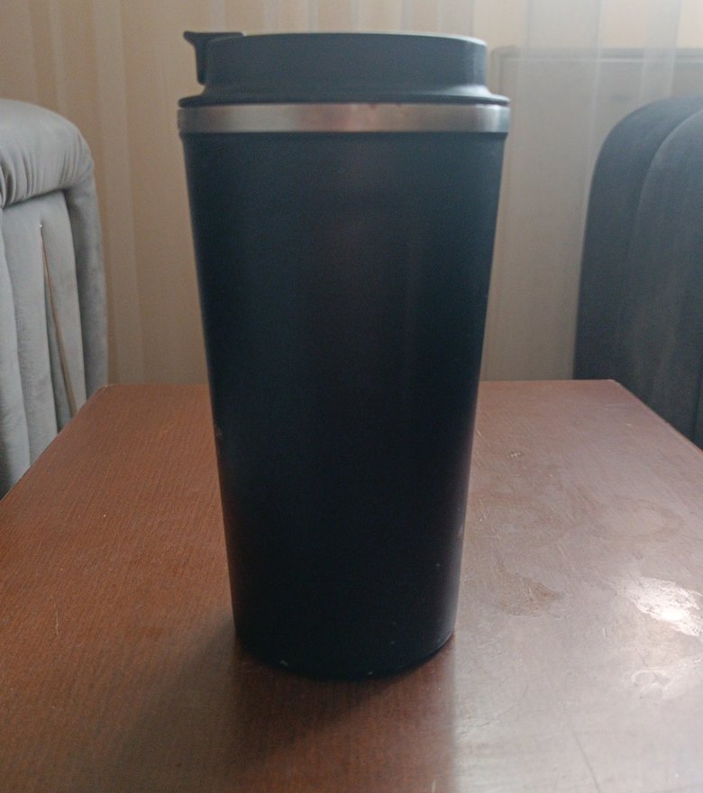 İçecekleri sıcak veya soğuk tutan kapaklı siyah seyahat termosu. Taşıması pratik ve kompakt. ☕