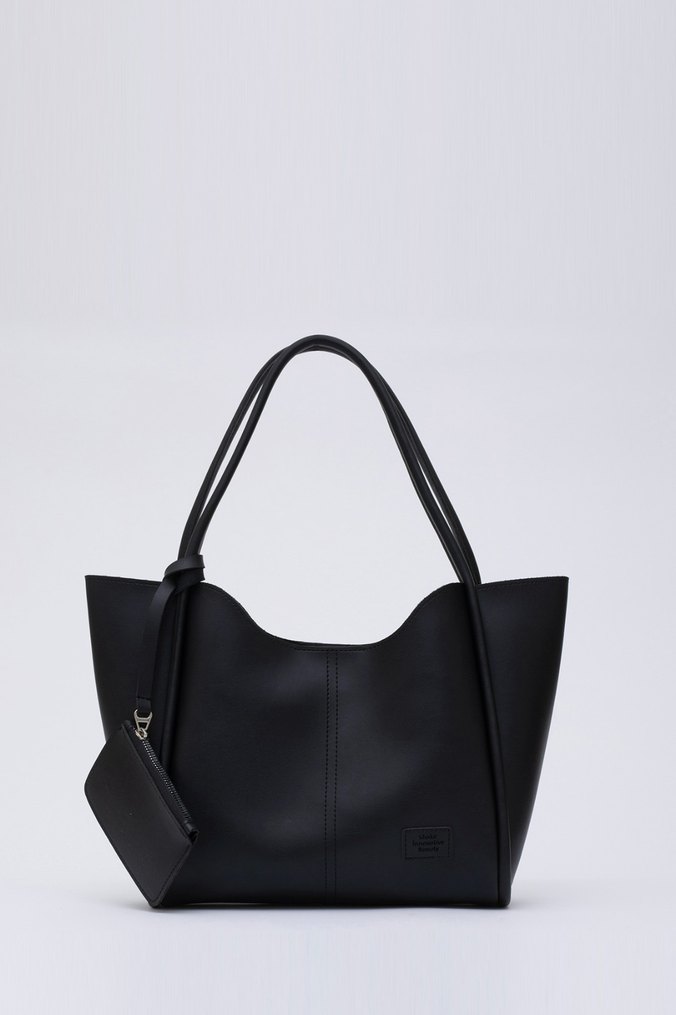 Siyah deri kadın çanta, minimalist ve çağdaş tasarıma sahiptir. Düz yüzeyi ve çift saplı yapısıyla günlük kullanıma uygundur, zahmetsiz şıklık sunar.