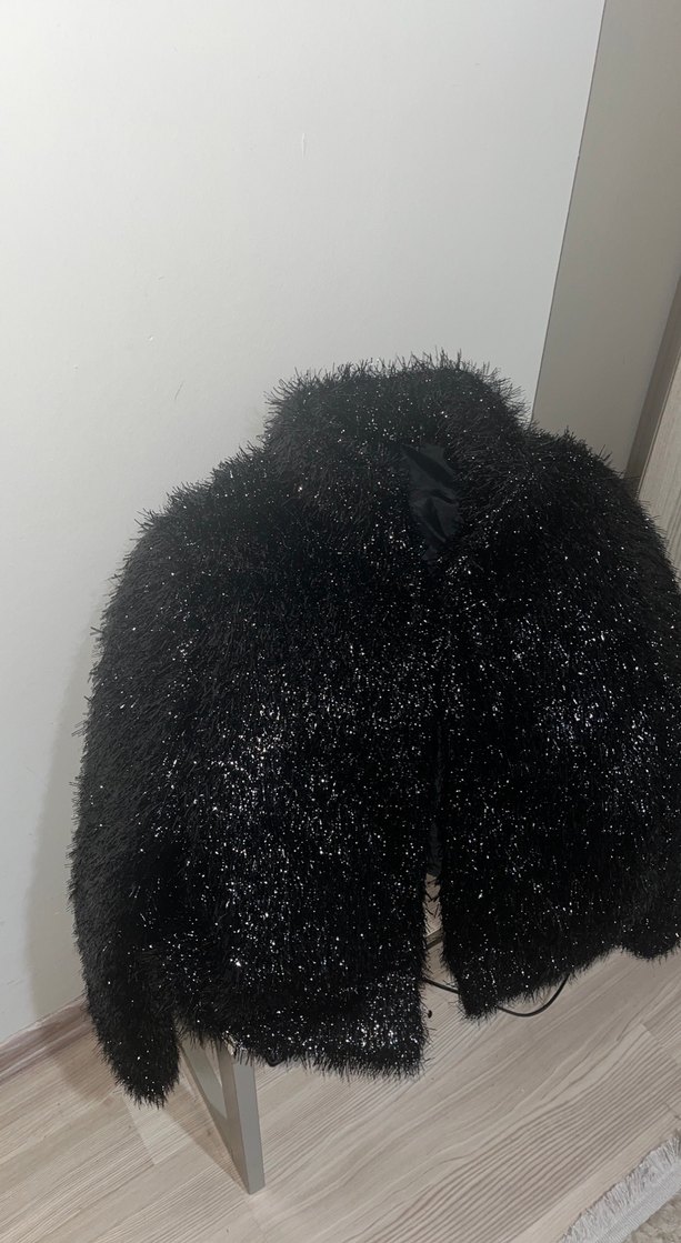 Siyah, kürk detaylı ve sentetik kumaştan yapılmış, uzun kollu, yakalı kısa kesim kadın cekettir. Parti için uygun, şık ve rahat bir parçadır. Markası: sezuco butik geçen sene almıştım fakat kendime yakıştırmadığım için hiç giymedim.