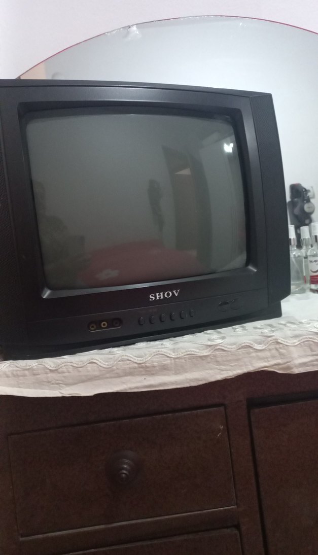 Gri renkli SHOV marka CRT monitör, kavisli ekran ve ön panelde manuel kontrol düğmelerine sahiptir. Ses giriş portları bulunmaktadır.