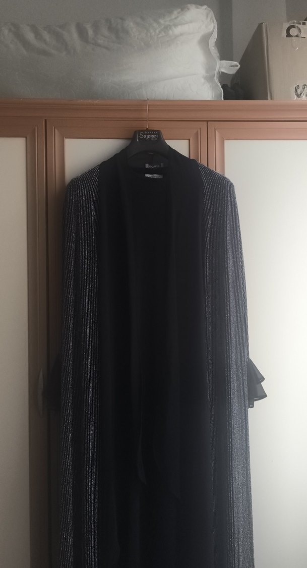 siyah uzun 2 parçadan oluşan içinde bir tane sıfır kol elbise üzerine de ceketi bulunan