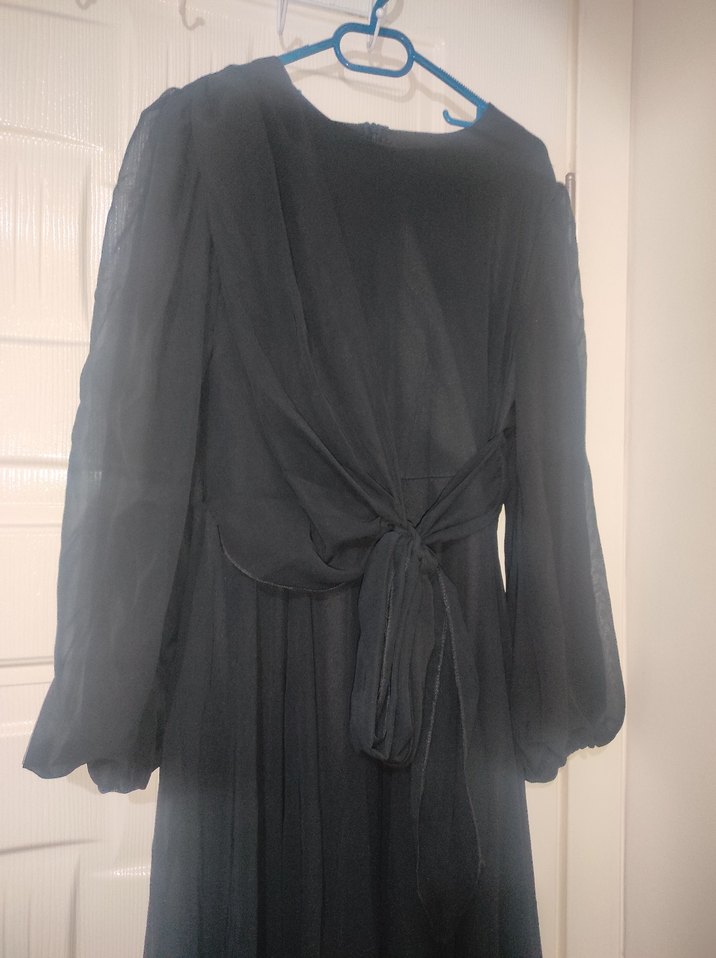 Astarlı bir elbisedir. Sade ve şık olunmak istenen her davette kullanılabilir. 36 38 beden için uygundur. değişik şekillerde bağlanabilen kumaş deyatı mevcuttur. Hiç giyilmedi.