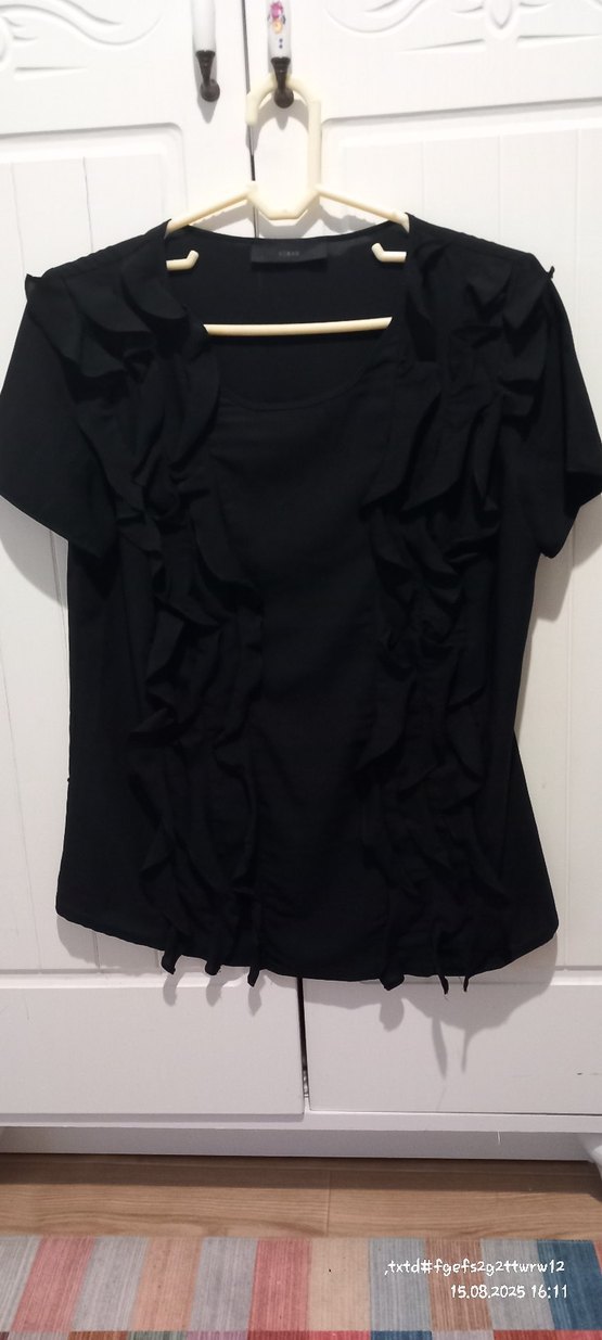 Siyah, şifon fırfırlı detaylara sahip kısa kollu bluz. şık ofis tercihi.