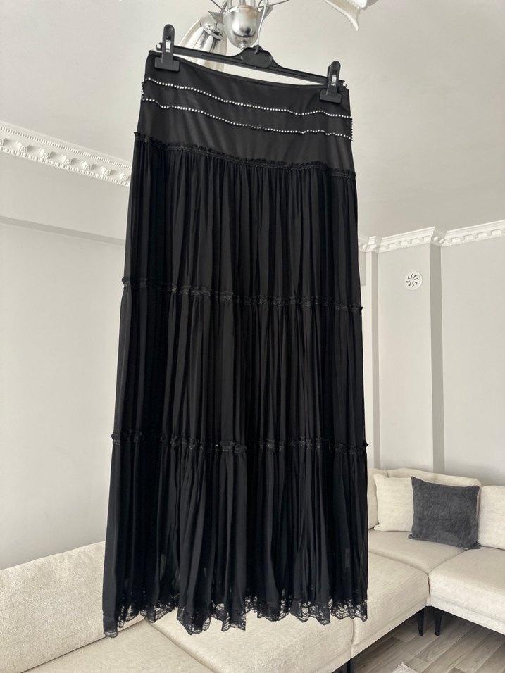 Siyah, pilili ve bol kesim uzun etek. Sentetik kumaştan üretilmiş, gotik tarzıyla günlük kullanıma uygundur.