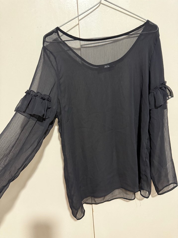Siyah Şifon kumaştan, uzun kollu, fırfırlı detaylı bol kesim bluz. Günlük kullanım için uygun, yuvarlak yaka tasarıma sahip.
