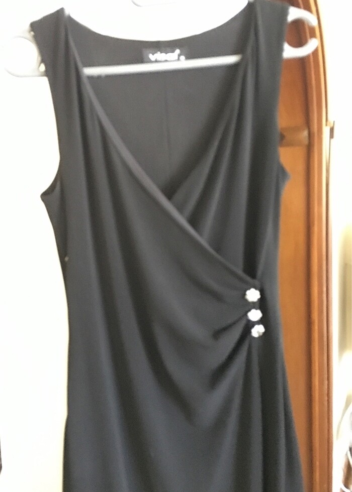 İster gece ister gündüz ister davet ister düğün her özel günde kullanılabilecek şık ve zarif bir elbise jarse kumaş asimetrik kesim ön kurveze yanda 3 düğme var birinin orta taşı düşmüş ama hiç belli olmuyor düğmelerin yanında hafif büzgüsü var kolsuz