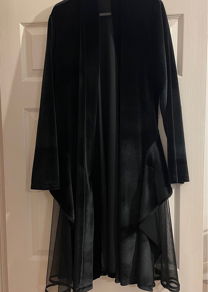 Siyah kadife şık kıyafet. Tül detayları bulunmakta. Abiye veya davet elbisesi olarak düşünebilirsiniz. Bir kez giyildi.