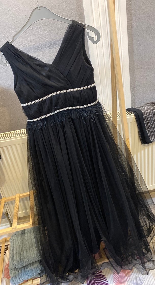 Siyah şık uzun belınte tüy ve taş detayları bulunmakta