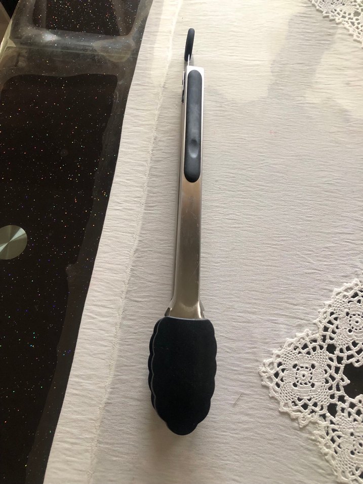 Siyah silikon uçlu ve metal saplı mutfak maşası, yiyecekleri güvenle tutar. Sapında asma halkası bulunur.