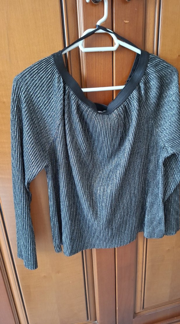 siyah sim cizgi detaylı, kayık yaka ve uzun kollu, bol kesim kadın bluzu. Günlük ve abiye olarak kullanıma uygundur.