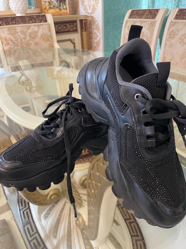 Siyah sim detaylı bağcıklı platform topuklu spor ayakkabılar. Kauçuk tabanlı, rahat ve şık sokak stili için uygundur.