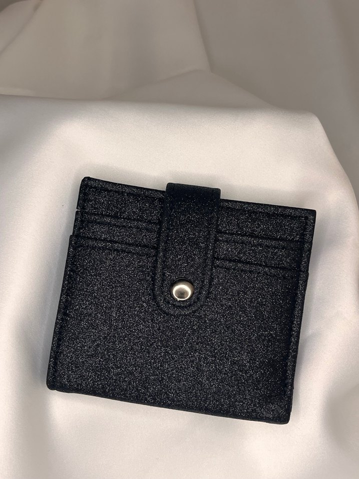 Velcro kapamalı siyah deri kadın cüzdanı, çoklu kart bölmeleri ve minimalist gotik tarzıyla günlük kullanıma uygundur.