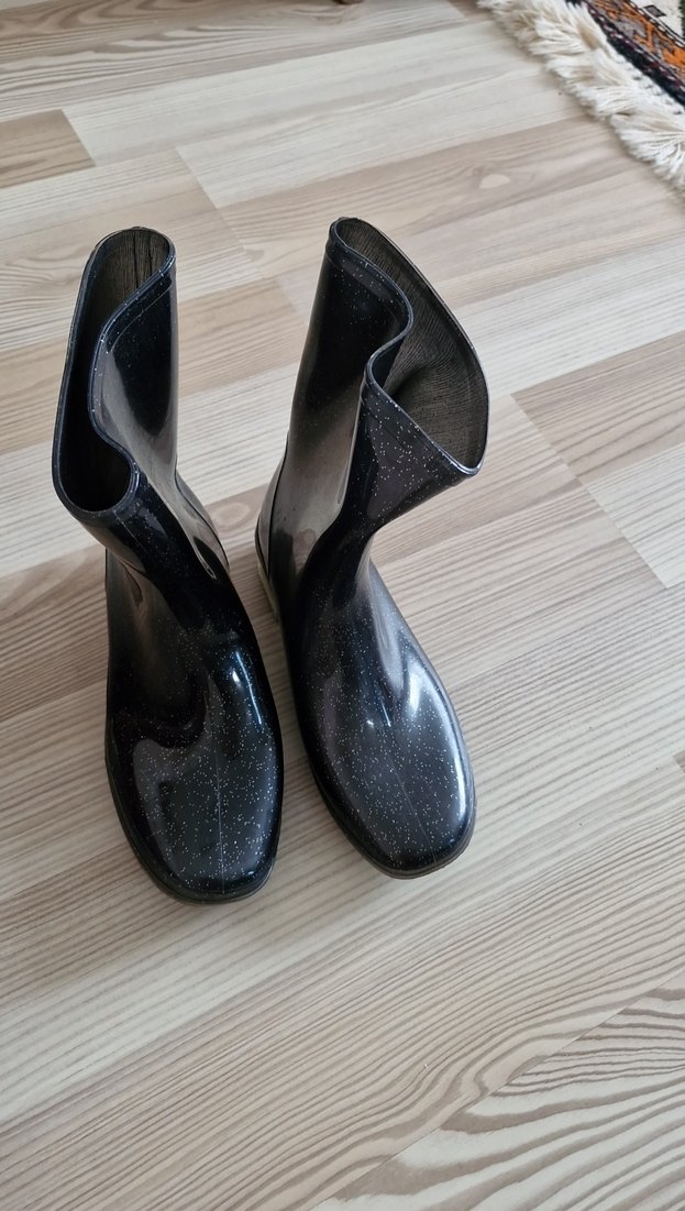 Siyah kauçuk kadın botları, ince topuklu ve sim detaylı, minimalist gotik tarzda, günlük kullanıma uygun. ✨