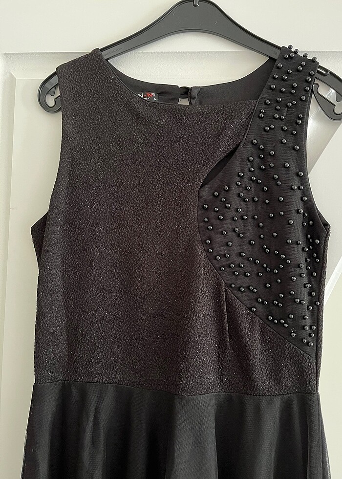 Siyah simli inci detaylı kısa abiye elbise