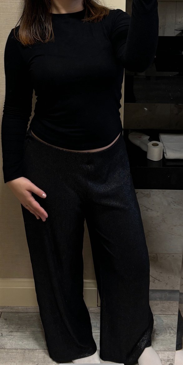 Güzel kumaştan yapılmış, siyah ve güzel uzunlukta, ofis için uygun şık ve rahat kesim pantolon simli ışıltılı harika pantolon kumaşı yumuşaktır sert değildir