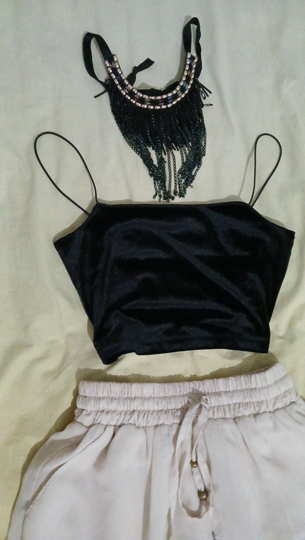 Siyah, ipek gibi yumuşak kumaştan, yüksek yakalı, drapeli ve bol kesimli mini crop top. İp askılı ve partiler için uygun şık simli goth tarzı. kolye ürünlere dahil değildir.
