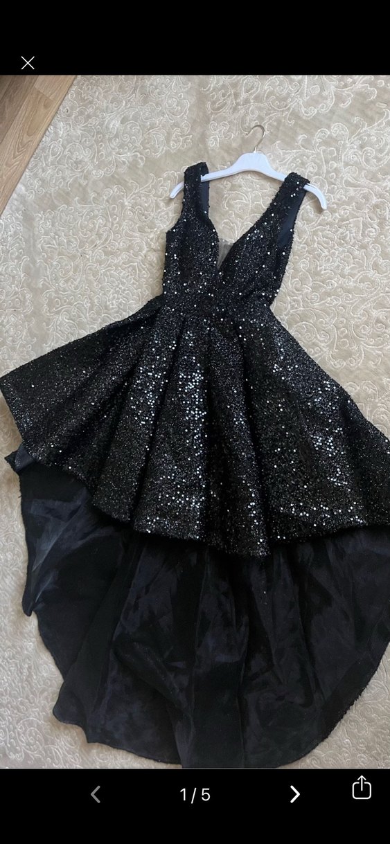 Siyah simli, V yakalı ve kolsuz önü kısa arkası uzun abiye elbise. Fit kesimi ve desenli yapısıyla partiler için göz alıcı bir seçenek. ✨. arkası ipli 36-38-40-42 uyumlu olur