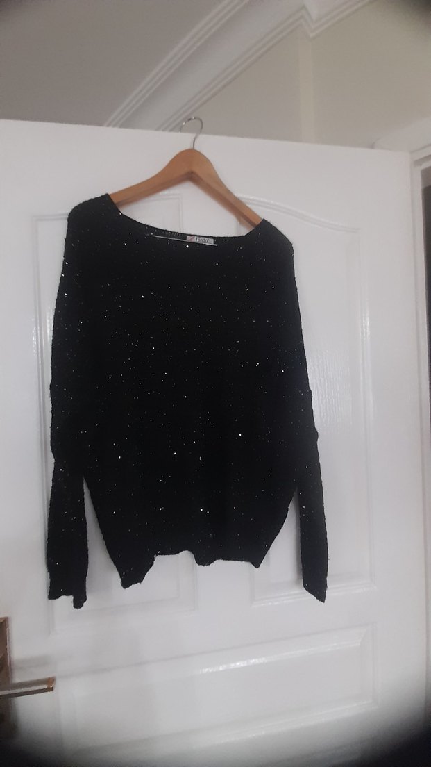 Siyah Simli Örgü Kadın Kazak, Uzun Kollu, Rahat Kesim