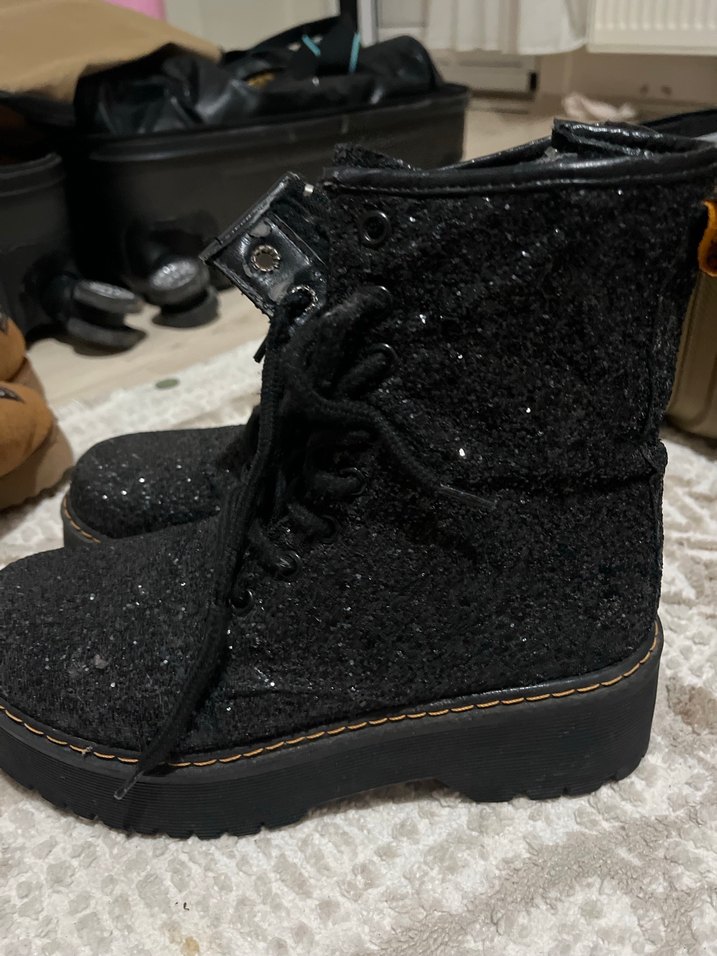 Siyah simli ve işlemeli detaylara sahip kauçuk botlar, platform topuklu, gotik tarz ve rock punk havası sunar. ✨36beden