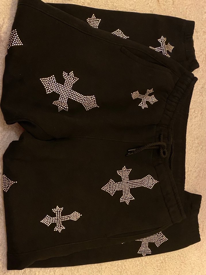 Siyah, nakışlı haç desenleri ve payet detaylı, sentetik kumaştan üretilmiş loose fit midi boy sweatpant. Günlük rahat stil için uygundur.
