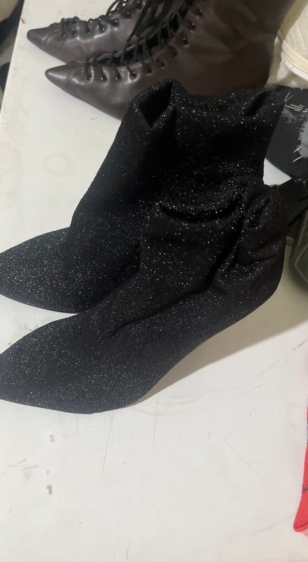 Siyah simli sentetik kumaştan yapılmış, stiletto topuklu, gotik tarzda kadın botları. Romantik gece için uygundur. ✨