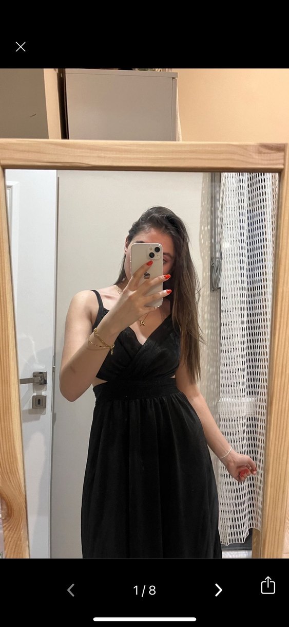 Bu siyah simli straplez midi elbise, ince askılı ve transparan detaylıdır. İpek gibi kumaştan üretilmiş olup cesur gotik tarza uygundur.
