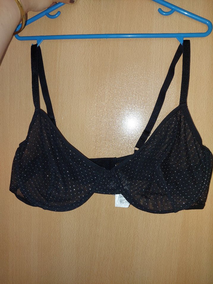 İnce askılı, simli siyah sütyen. Normal uzunlukta, rahat bir kullanım sunar. 95 beden