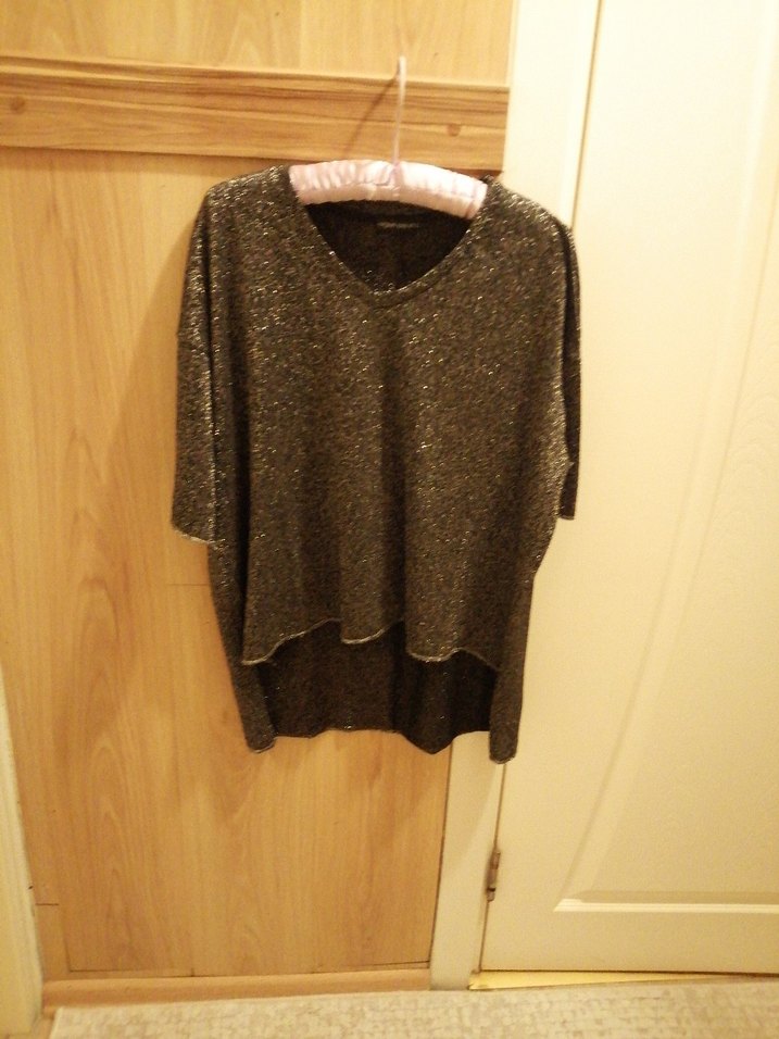 Siyah simli triko, bol kesim, yuvarlak yaka ve uzun kollu kazak. Normal midi boyda, desensiz, rahat günlük kullanım için uygun.